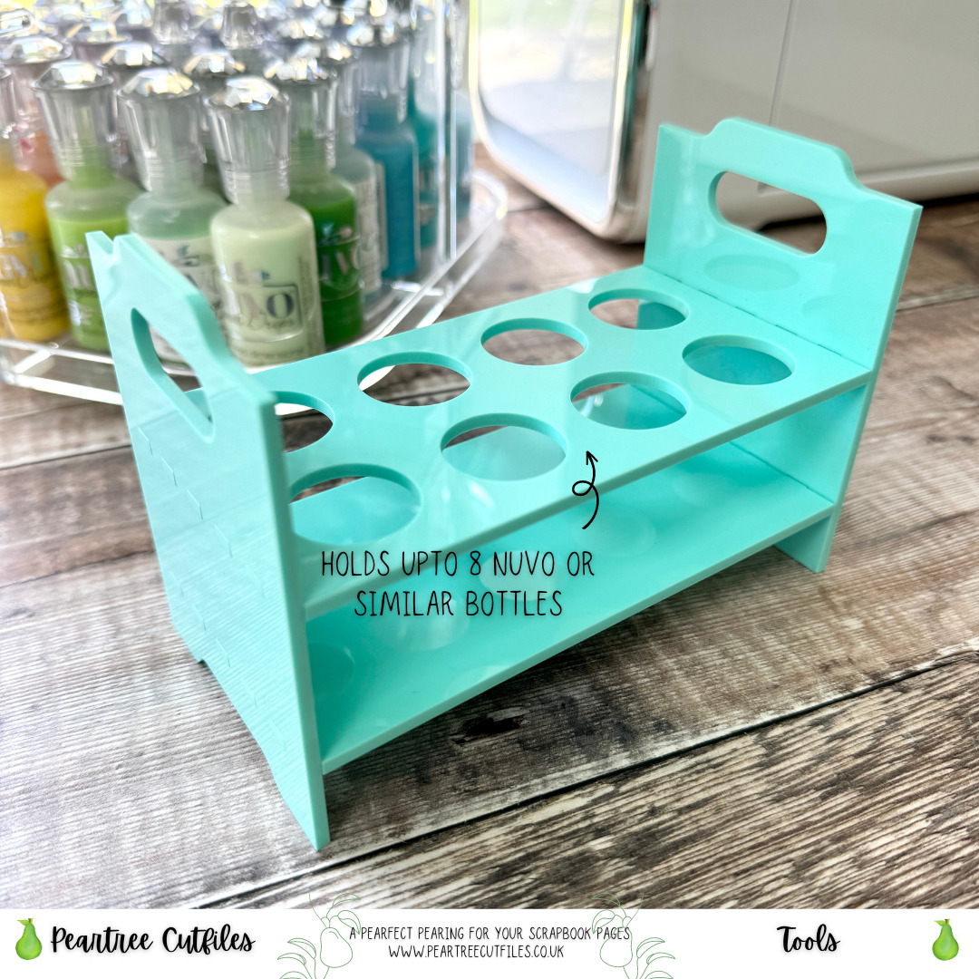 Available in Clear or Mint Acrylic. Packet contains four pieces that fit together to make the Nuvo holder. Laser cut from 3mm acrylic. The largest piece is approximately 5 by 2.5 inches in length. NB Nuvo drops not included.